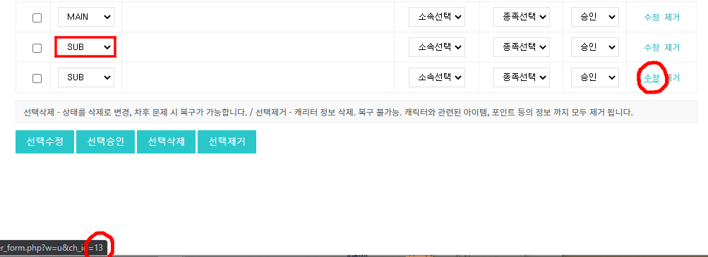 일단.. 캐릭터를 만들어주세요. 캐릭터를 만들었다면 아래처럼 관리자 페이지 [캐릭터 관리]에서 캐릭터 타입을 SUB로 바꿔줍시다. 빨간 박스가 MAIN 에서 SUB로 바꿀 수 있는 곳입니다. 바꾸셨다면 이제 멤버란에서 캐릭터가 보이지 않을 겁니다.